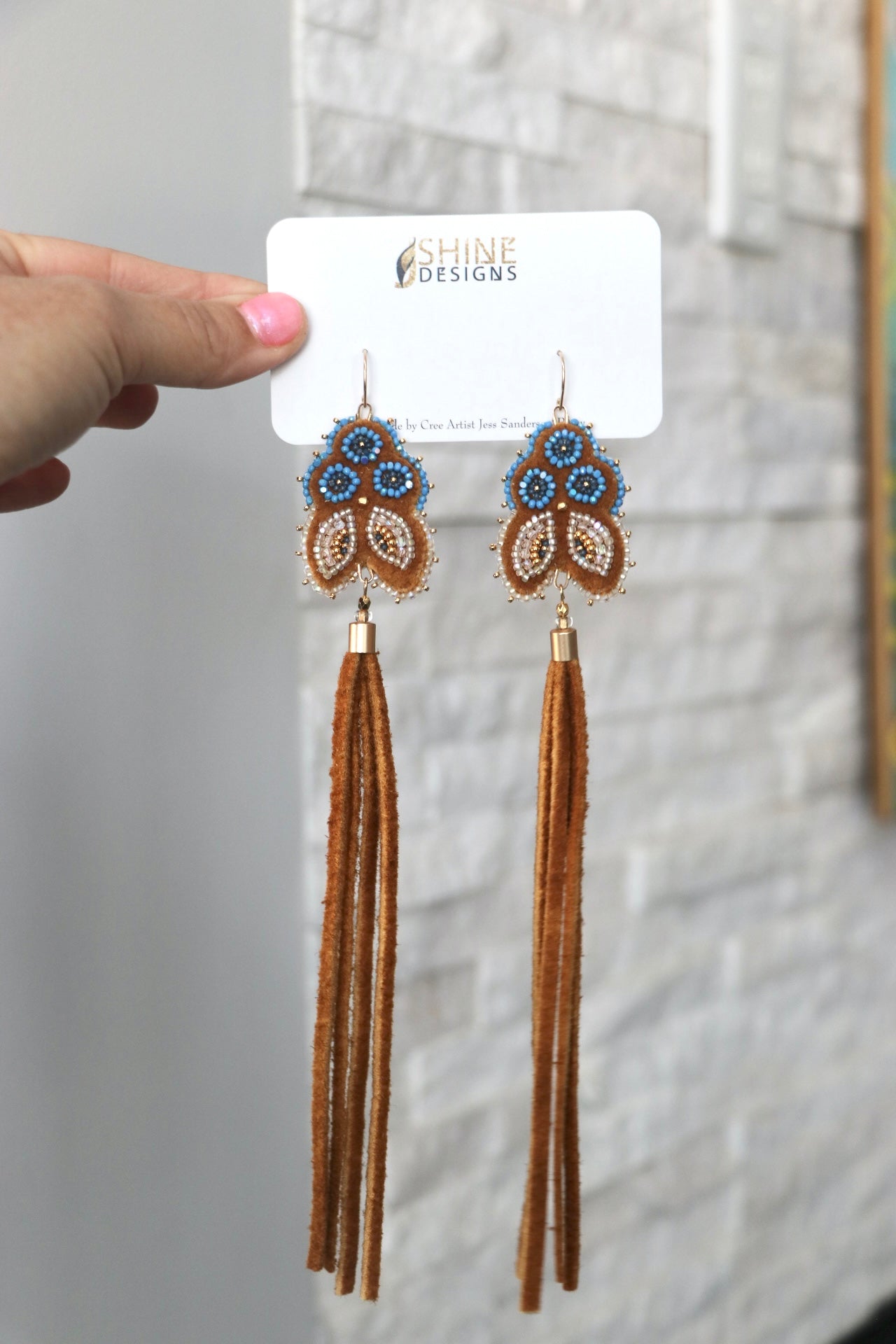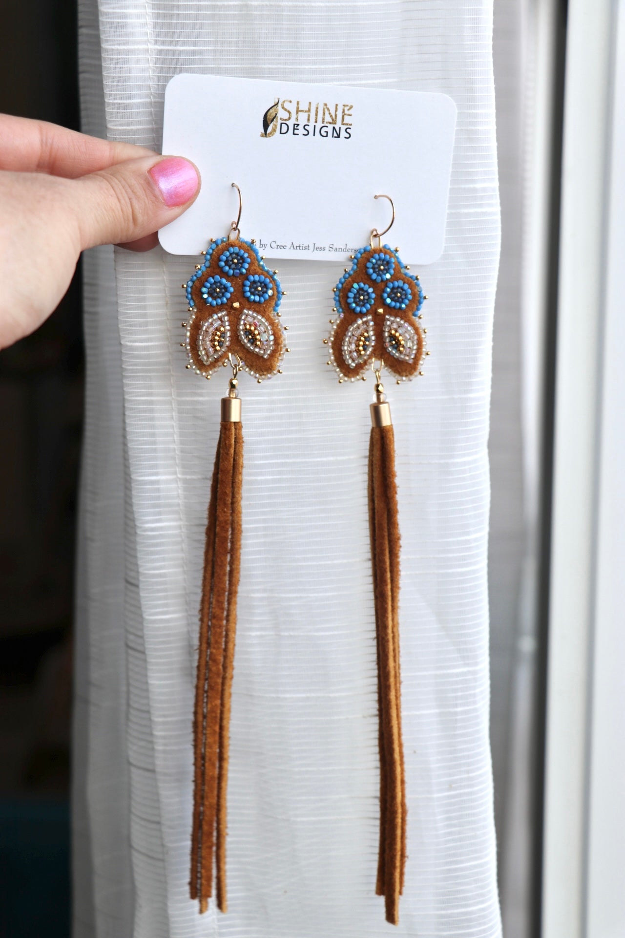 These earrings embrace growth & beauty using elements from the land. Made with home tanned moose hide, 24k plated gold beads, all findings and hooks are gold filled. Very light weight with an 9-9.5 inch drop. Cut to your length.
