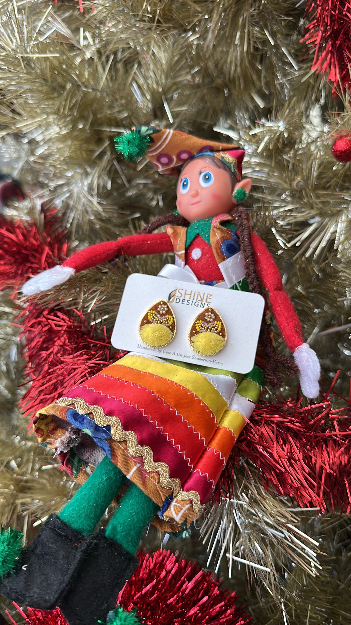 this is for one (1) pair of moose drops with caribou tufted earrings.  Made of home tanned moose, mystery hardware backing, 24k gold plated beads and dyed caribou hair.